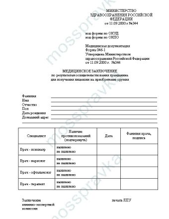 Важный этап – посещение психиатра и нарколога, сдача крови и мочи (за плату). Врач-психиатр выдаёт подтверждение в адекватности человека, удостоверяет, что он не состоит на учёте, не имеет запретов к владению оружием и занятию охранным делом. Специалист наркологии, учитывая данные химико-токсикологической экспертизы на запрещённые вещества и их метаболиты, отметит в форме 003-О/у отсутствие наркозависимости и тяги к алкоголю. Обязательно посещается офтальмолог (удобнее в медцентре), если зрение хуже 50%, то такое противопоказание не даст получить бланк. После сбора документов справка выдаётся терапевтом в электронном формате, без которого бумажная версия ничтожна.