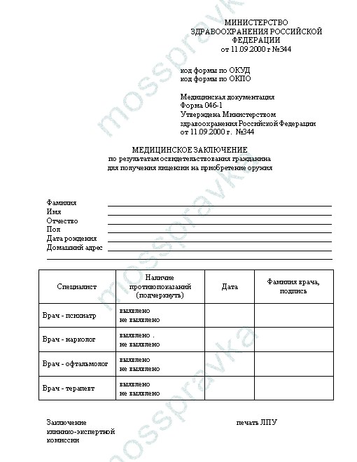 Главные получатель бланка – охранники 4, 5 и 6 разрядов, желающие обеспечивать безопасность людей и объектов, и те, кому необходимо продлить разрешение на оружие для охранных агентств или работе в охране по совместительству. Пистолет для самообороны или защиты грузов (газовый или огнестрельный), ножи, кинжалы, признанные холодным оружием, обязывают, чтобы была получена справка 002-ЧО/у (бывшая 046/у). При этом освидетельствование у специалистов и анализы на заканчивающееся разрешение на владение арсеналом должны быть пройдены заблаговременно, чтобы избежать изъятия средств. Цели, для каких нужен медицинскийдокумент: